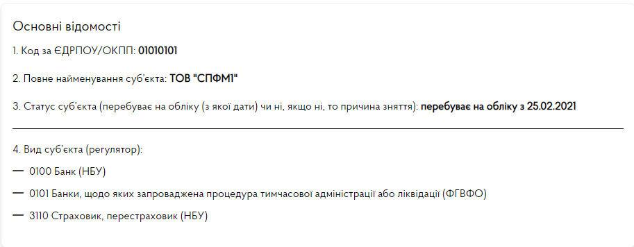 Основні відомості: цей розділ містить в собі інформацію про "ЄДРПОУ/ОКПП", "Найменування", "Статус суб'єкту"